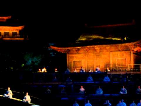 這中間最高潮的應該是突然有兩個穿著發光衣的武僧突然從我們觀眾席這邊的高台上吊著鋼絲往舞台中間飛去,根本就是「臥虎藏龍」的畫面重現,霎時大家都發出讚嘆的聲音,因為感覺上真的很唯美。